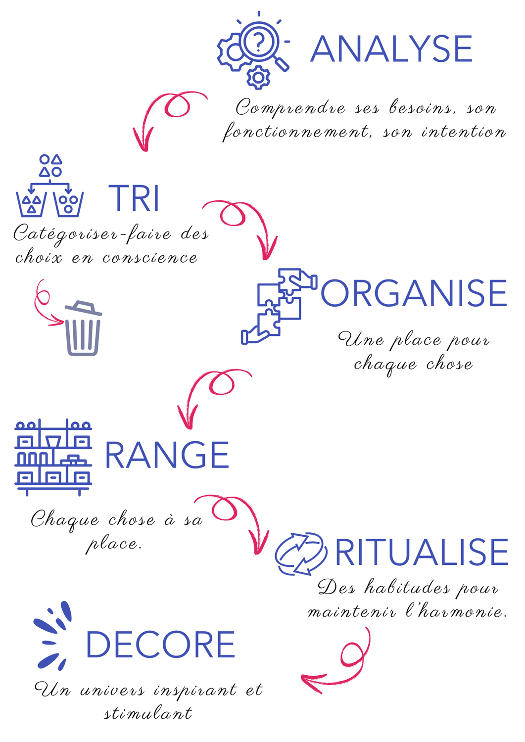 1️⃣ Analyse & Vision → Je t'accompagne à l'audit de ton espace de travail et prenant conscience que cela t'empêche d'être productive.
